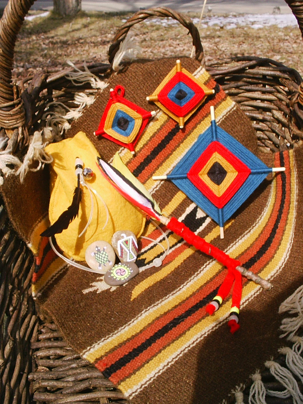 by elk skin frame drum, cedar flute, rainstick, Native Tribes of America Map and